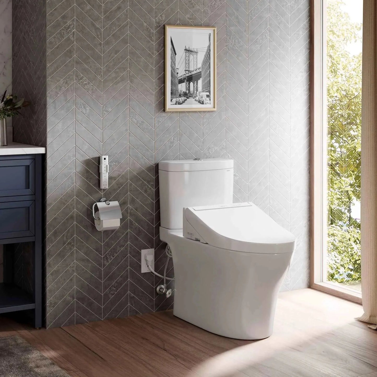 The TOTO T40 WASHLET+® Aquia IV One-Piece Elongated Dual Flush 1.28 and 0.9 GPF Toilet and WASHLET® C5 Bidet Seat is designed to conceal the WASHLET power cord and water supply hose for a seamless installation.