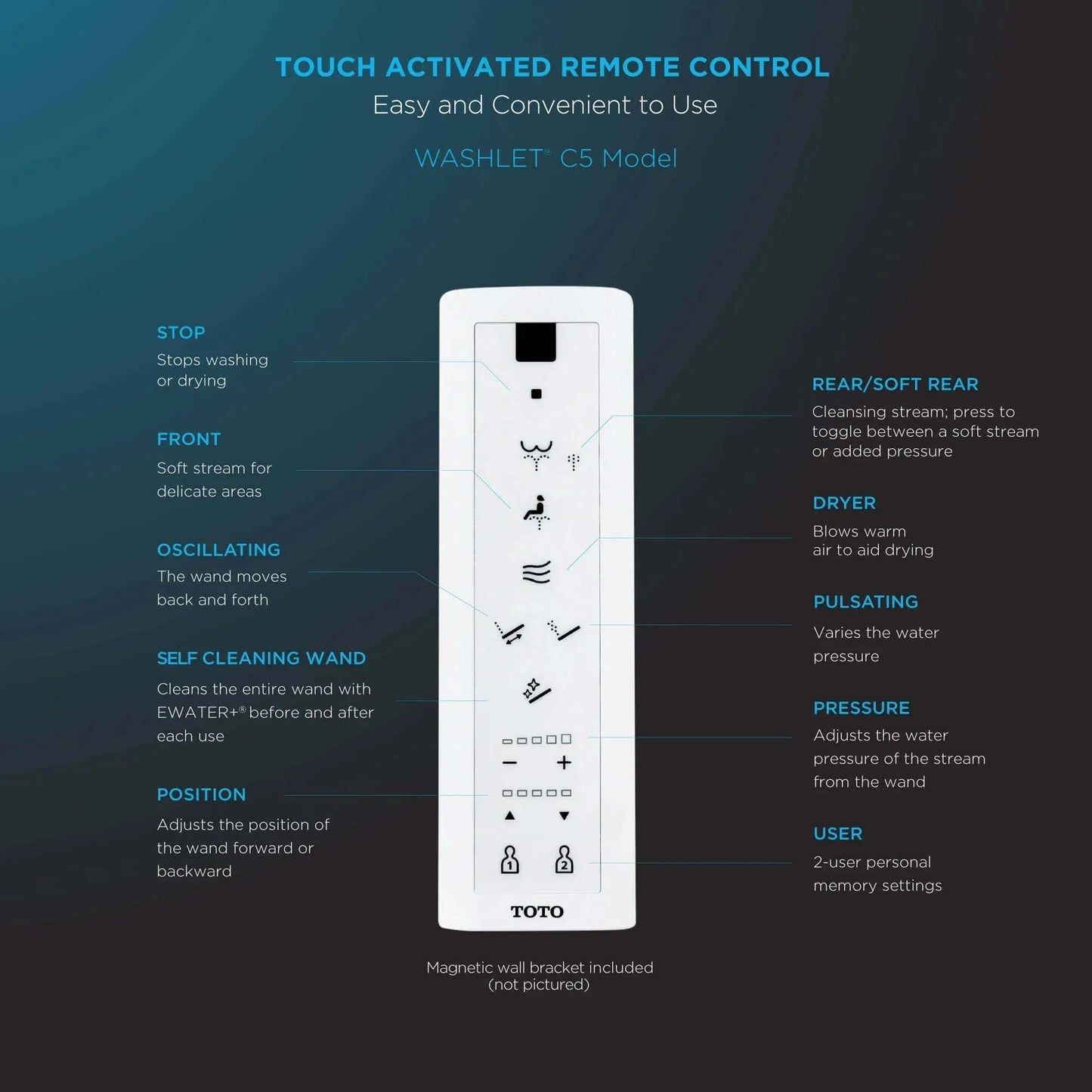 The controls are located on a slim, wireless remote. PREMIST® wets the surface of the toilet bowl, aiding in the removal of waste and resulting in a better clean.
